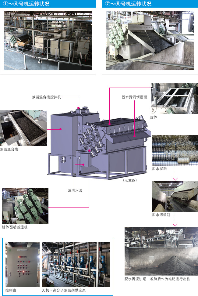 弊公司本次已收到畜牧養(yǎng)殖業(yè)公司的詢盤,考慮更新其現(xiàn)有其他公司生產(chǎn)的4臺帶式壓榨脫水機。經(jīng)過再三研討相應機型,考慮到畜牧養(yǎng)殖污泥中包含牧草及飼料殘渣,故而選擇了多重圓板式脫水機JD型。使用無機絮凝劑和高分子絮凝劑進行模擬的結(jié)果顯示,含水率降到了78%及以下。此外,JD型憑借其運轉(zhuǎn)管理的便捷性、可支持夜間運轉(zhuǎn)的可靠性等綜合實力,獲得了客戶的好評,最終采用了8臺濾體寬度為2000mm的最大機型JD-2000S型產(chǎn)品。同時,他們還將脫水后的污泥餅進行發(fā)酵后作為農(nóng)業(yè)堆肥進行出售。